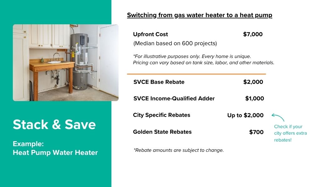From do-it-yourself to done-for-you, Silicon Valley Clean Energy (SVCE) offers rebates and services you need to upgrade your home with high-efficiency electric appliances. You can receive up to $3,000 in SVCE rebates for a heat pump water heater, which are fully stackable with other available federal, state, and local incentives.