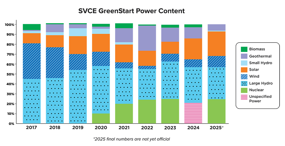 This graph shows the annual mix of energy sources Silicon Valley Clean Energy reports to the California Energy Commission on its Power Content Label.